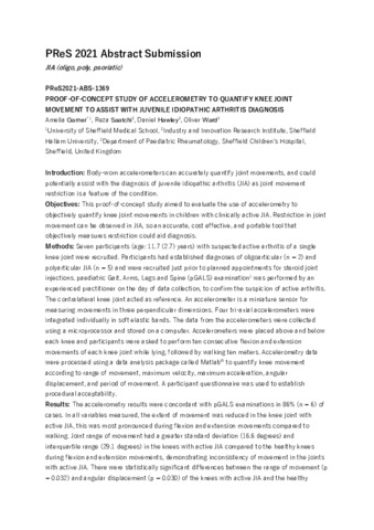 GARNER, Amelia, SAATCHI, Reza, HAWLEY, Daniel and WARD, Oliver (2021). Proof-of-concept study of accelerometery to quantify knee joint movement to assist with juvenile idiopathic arthritis diagnosis [abstract only]. In: 27th European Paediatric Rheumatology Congress, Virtual, 19-21 Sep 2021. 27th European Paediatric Rheumatology Congress. (Unpublished) [Conference or Workshop Item]