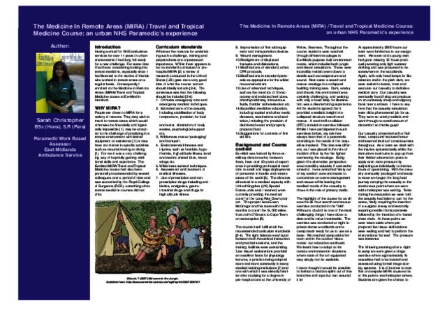 CHRISTOPHER, Sarah (2007). The medicine in remote areas (MIRA)/travel and tropical medicine course: an urban NHS paramedic’s experience. Today's Emergency, 13 (3), 72-75. [Article]