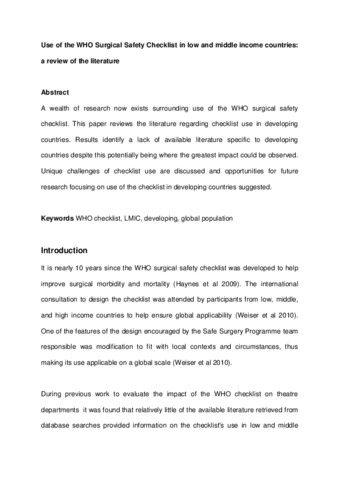 CADMAN, Victoria (2018). Use of the WHO Surgical Safety Checklist in low and middle income countries: a review of the literature. Journal of perioperative practice, 28 (12), 334-338. [Article]