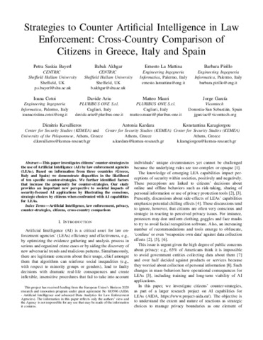 BAYERL, Petra Saskia, AKHGAR, Babak, LA MATTINA, Ernesto, PIRILLO, Barbara, COTOI, Ioana, ARIU, Davide, MAURI, Matteo, GARCIA, Jorge, KAVALLIEROS, Dimitris, KARDARA, Antonia and KARAGIORGOU, Konstantina (2021). Strategies to Counter Artificial Intelligence in Law Enforcement: Cross-Country Comparison of Citizens in Greece, Italy and Spain. In: - Transactions on Computational Science & Computational Intelligence . Cham, Switzerland, Springer. [Book Section]
