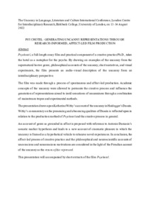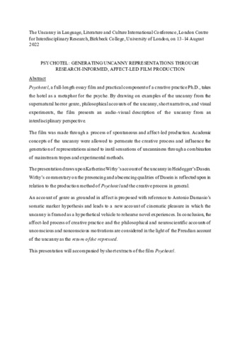 GENT, Susannah (2022). “Psychotel: Generating Uncanny Representations Through Research-informed, Affect-led Film Production” [abstract only]. In: The Uncanny in Language, Literature and Culture, London, UK, 13-14 Aug 2022. (Unpublished) [Conference or Workshop Item]