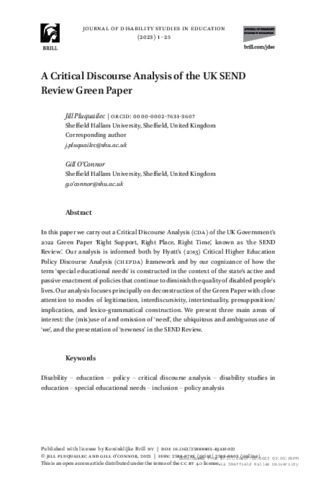 PLUQUAILEC, Jill and O'CONNOR, Gill (2023). A critical discourse analysis of the UK SEND review green paper. Journal of Disability Studies in Education. [Article]