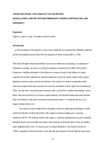 The Crying Boy is a label used to describe a genre of inexpensive, mass-produced portrait print that were popular during the 1970s with working class families in the UK. In 1985-86 a tabloid newspaper, The Sun, published a series of hyperbolic stories reporting a ‘curse’ that was allegedly attached to this example of folk art. The source of the rumour were fire fighters who reported the frequent occurrence of undamaged examples of the prints at domestic property fires in one South Yorkshire mining community. The intervention of journalists introduced the idea of the ‘curse’ and added a supernatural/inexplicable element to the story. This article revises content from a summary account of the ‘crying boy’ narratives published in 2008 (Clarke 2008; Clarke 2011). This analysis updates the developing legend with new material including interviews with the journalists and the results of a content analysis of news coverage. It examines the specific role played by journalists in the evolution of the nascent contemporary legend from print to social media.