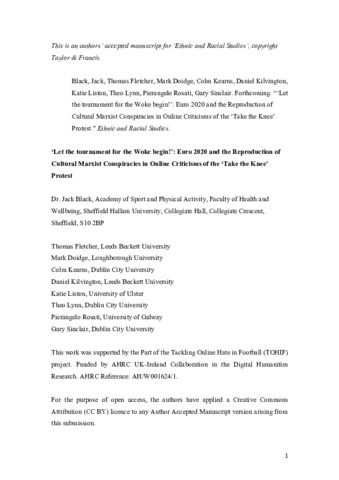 BLACK, Jack, FLETCHER, Thomas, DOIDGE, Mark, KEARNS, Colm, KILVINGTON, Daniel, LISTON, Katie, LYNN, Theo, ROSATI, Pierangelo and SINCLAIR, Gary (2023). 'Let the tournament for the Woke begin!': Euro 2020 and the reproduction of Cultural Marxist conspiracies in online criticisms of the 'Take the Knee' protest. Ethnic and Racial Studies. [Article]