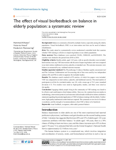 ALHASAN, Hammad, HOOD, Vicky and MAINWARING, Frederick (2017). The effect of visual biofeedback on balance in elderly population: a systematic review. Clinical interventions in aging, 12, 487-497. [Article]