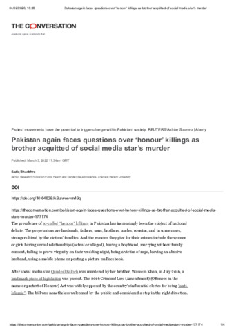 BHANBHRO, Sadiq (2022). Pakistan again faces questions over ‘honour’ killings as brother acquitted of social media star’s murder. The Conversation. [Article]