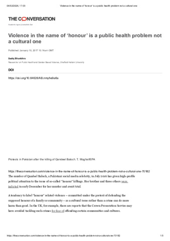 BHANBHRO, Sadiq (2017). Violence in the name of ‘honour’ is a public health problem not a cultural one. The Conversation. [Article]