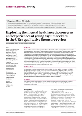 WEST, Richard, CARDIFF, Edel, AL-SALTI, Faten, RODERICK, Emma and BHANBHRO, Sadiq (2025). Exploring the mental health needs, concerns and experiences of young asylum seekers in the UK: a qualitative literature review. Mental Health Practice, 28 (6). [Article]