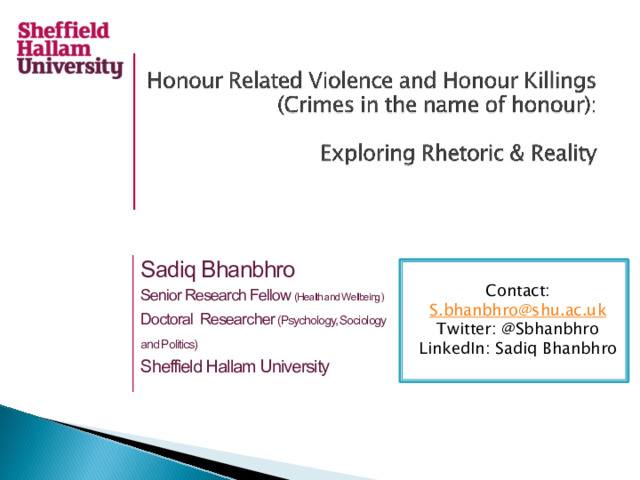 BHANBHRO, Sadiq (2019). Honour Related Violence and Honour Killings (Crimes in the name of honour): Exploring Rhetoric & Reality. In: Evaluating Evidence for Practice L6 Student Inspirational Lecture, Sheffield, UK, 16 Apr 2019. Depart of Nursing and Midwifery, Sheffield Hallam University. (Unpublished) [Conference or Workshop Item]