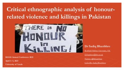 BHANBHRO, Sadiq (2023). Critical Ethnographic Analysis of Honour-Related Violence and Killings in Pakistan. In: British Association of South Asian Studies Annual Conference, Leeds, UK, 03-06 Apr 2023. British Association of South Asian Studies (BASAS). (Unpublished) [Conference or Workshop Item]