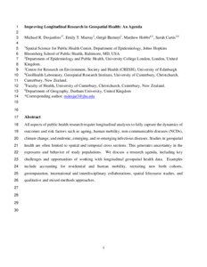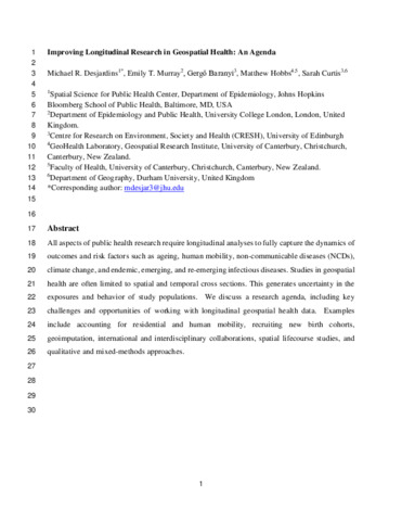 DESJARDINS, Michael R, MURRAY, Emily T, BARANYI, Gergő, HOBBS, Matthew and CURTIS, Sarah (2023). Improving longitudinal research in geospatial health: An agenda. Health & place, 80: 102994. [Article]