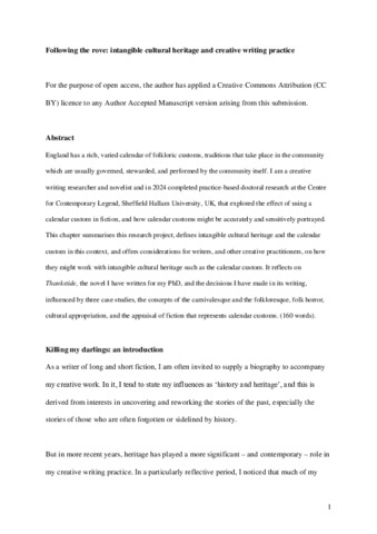 PARKES-NIELD, Sophie (2025). Following the rove: intangible cultural heritage and creative writing practice 1. In: CASS, Nick, POWELL, Anna and WAKEFIELD, Sarina, (eds.) The Routledge Handbook of Heritage and Creative Practice. Routledge Handbooks . London, Routledge, 108-122. [Book Section]