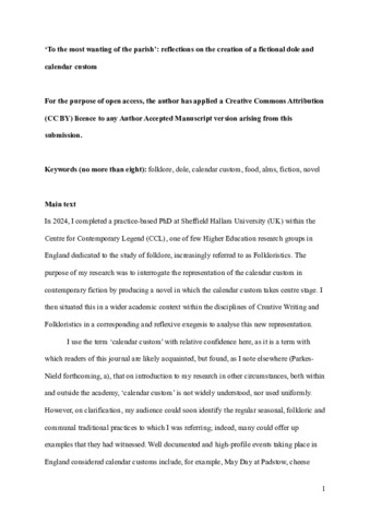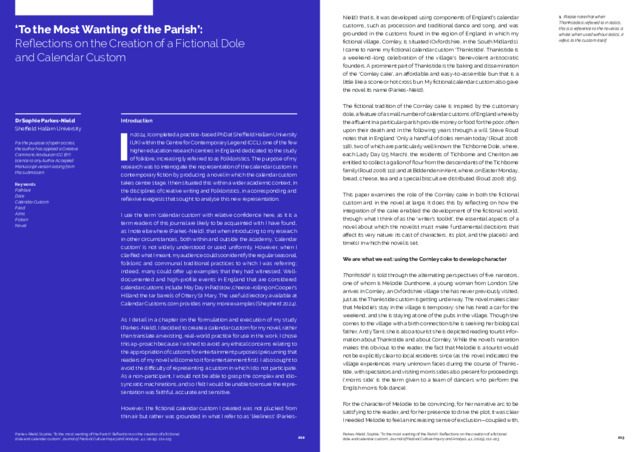 PARKES-NIELD, Sophie (2025). ‘To the most wanting of the parish’: reflections on the creation of a fictional dole and calendar custom. Journal of Festival Culture Inquiry and Analysis, 4 (1), 212-223. [Article]