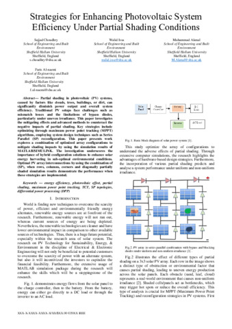 CHOUDHRY, Sajjad, ISSA, Walid, AKMAL, Muhammad and AL-NAEMI, Faris (2025). Strategies for Enhancing Photovoltaic System Efficiency Under Partial Shading Conditions. In: 2025 60th International Universities Power Engineering Conference (UPEC). IEEE. [Book Section]