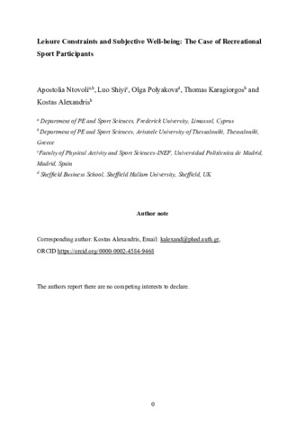 NTOVOLI, Apostolia, LUO, Shiyi, POLYAKOVA, Olga, KARAGIORGOS, Thomas and ALEXANDRIS, Kostas (2025). Leisure Constraints and Subjective Well-being: The Case of Recreational Sport Participants. Leisure Sciences. [Article]