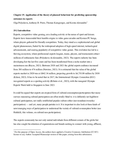 POLYAKOVA, Olga, PIZZO, Anthony D, KARAGIORGOS, Thomas and ALEXANDRIS, Kostas (2026). Application of the theory of planned behaviour for predicting sponsorship outcomes in esports. In: SMITH MAGUIRE, Jennifer, (ed.) Research Handbook on the Sociology of Consumption. Research handbooks in Sociology . Edward Elgar, 229-239. [Book Section]