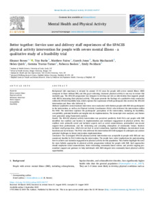 BOWES, Eleanor, BURKE, Trys, FAIRES, Matthew, JONES, Gareth, MACHACZEK, Katarzyna, QUIRK, Helen, TRAVISS-TURNER, Gemma, BEEKEN, Rebecca and PECKHAM, Emily (2025). Better Together: Service User and Delivery Staff Experiences of the SPACES Physical Activity Intervention for People with Severe Mental Illness- A Qualitative Study of a Feasibility Trial. Mental Health and Physical Activity: 100717. [Article]