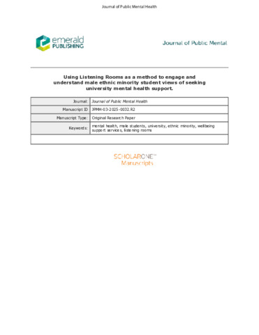 WOLSTENHOLME, Claire and SEN, Jozef (2025). Using Listening Rooms as a method to engage and understand male ethnic minority student views of seeking university mental health support. Journal of Public Mental Health. [Article]