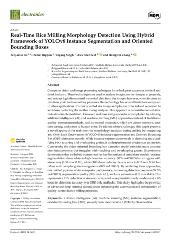 ILO, Benjamin, RIPPON, Daniel, SINGH, Yogang, SHENFIELD, Alex and ZHANG, Hongwei (2025). Real-Time Rice Milling Morphology Detection Using Hybrid Framework of YOLOv8 Instance Segmentation and Oriented Bounding Boxes. Electronics, 14 (18): 3691. [Article]