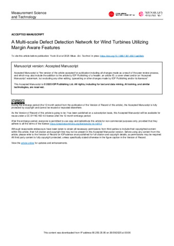 SI, Yuxin, DING, Yunfei, GE, FuDi, WU, Xingtao, LIU, Jinglin, DING, Dong and ZHANG, Hongwei (2025). A Multi-scale Defect Detection Network for Wind Turbines Utilizing Margin Aware Features. Measurement Science and Technology, 36 (9): 095416. [Article]