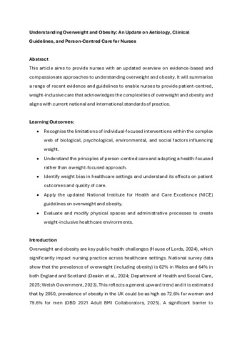 O'HARA, Beverley, NIELD, Lucie and BEAUMONT, Jordan (2025). Understanding Overweight and Obesity: contemporary evidence-based approaches to delivering person-centred nursing care. Nursing Standard. [Article]