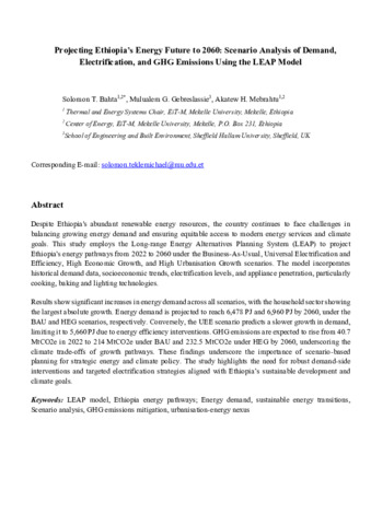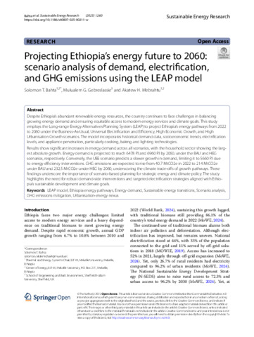 BAHTA, Solomon T, GEBRESLASSIE, Mulualem Gebregiorgis and MEBRAHTU, Akatew H (2025). Projecting Ethiopia’s energy future to 2060: scenario analysis of demand, electrification, and GHG emissions using the LEAP model. Sustainable Energy Research, 12 (1): 60. [Article]