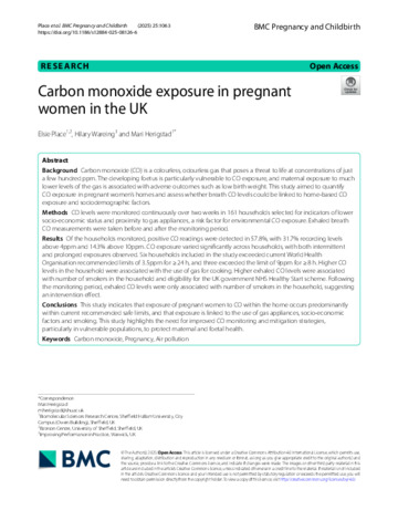 PLACE, Elsie, WAREING, Hilary and HERIGSTAD, Mari (2025). Carbon monoxide exposure in pregnant women in the UK. BMC Pregnancy and Childbirth, 25 (1): 1063. [Article]