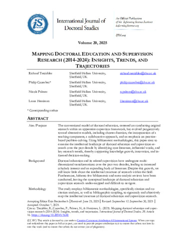 TRESIDDER, Richard, COOMBES, Philip, PALMER, Nicola and HERRIMAN, Laura (2025). Mapping Doctoral Education and Supervision Research (2014-2024): Insights, Trends and Trajectories. International Journal of Doctoral Studies, 20. [Article]