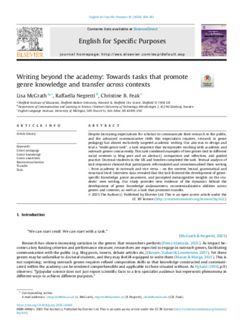 MCGRATH, Lisa, NEGRETTI, Raffaella and FEAK, Christine (2026). Writing beyond the academy: towards tasks that promote genre knowledge and transfer across contexts. English for Specific Purposes, 81, 169-183. [Article]