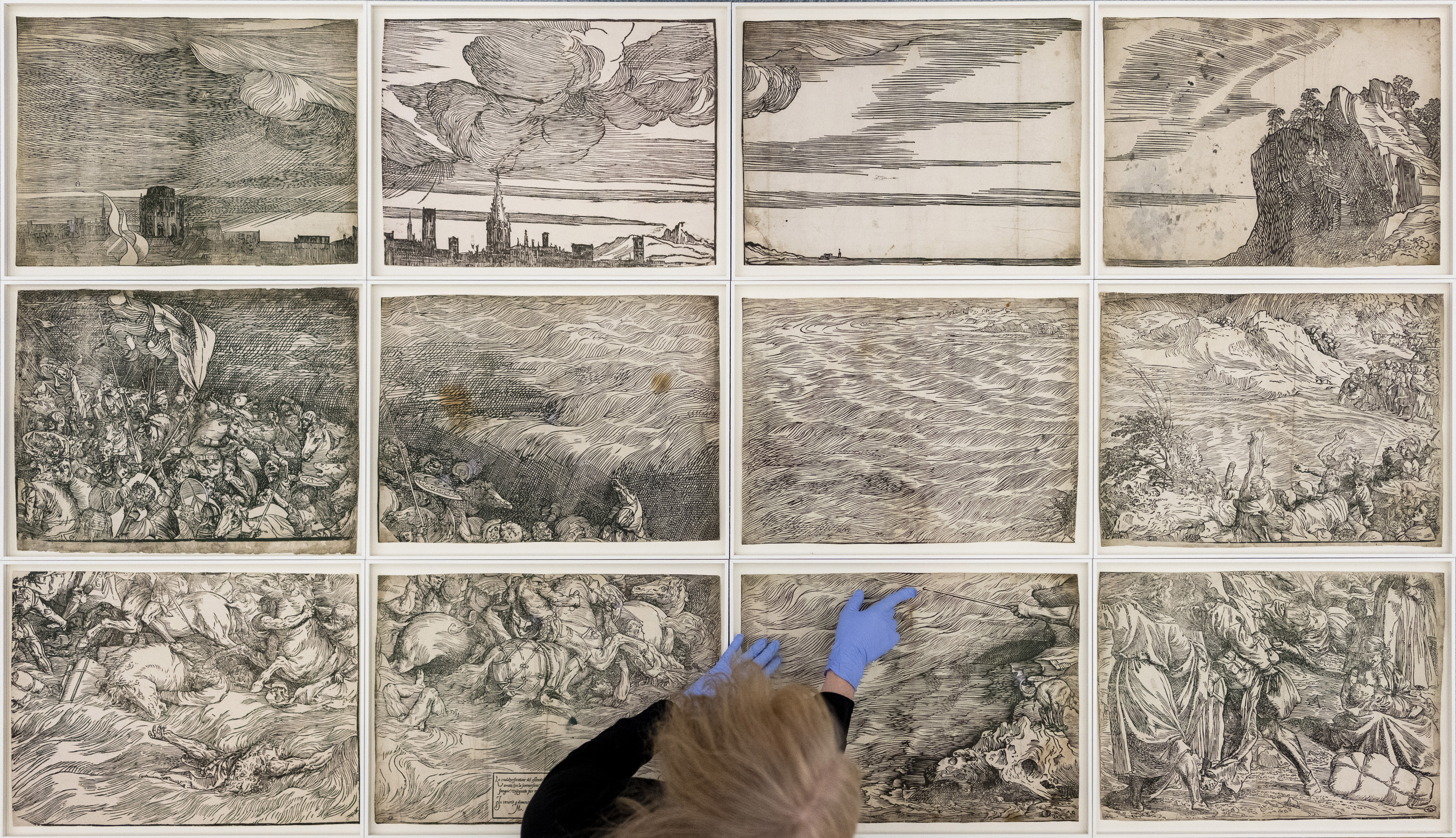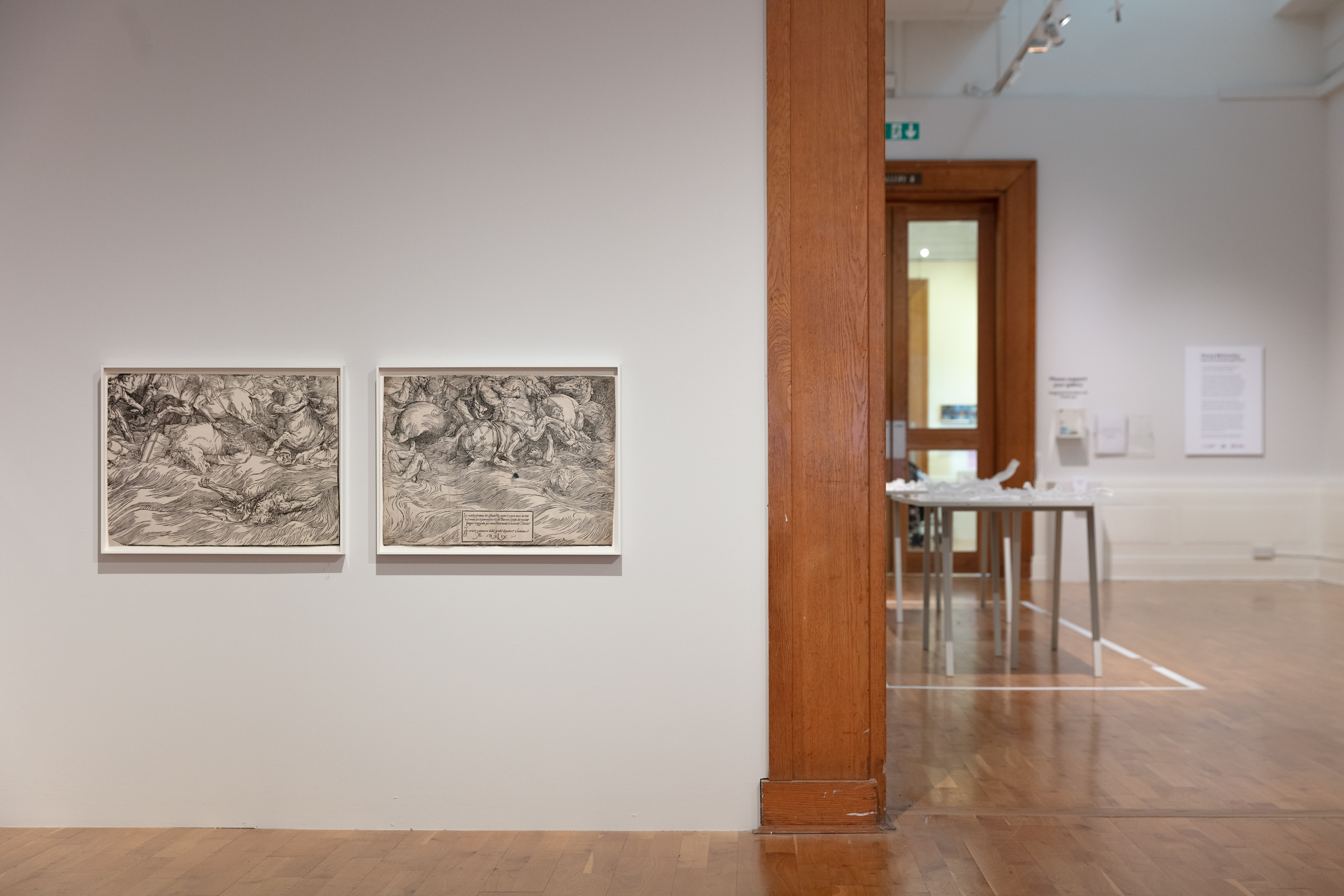 This new body of work by artist Penny McCarthy explores how the passage of time affects our perception and interpretation of images. McCarthy draws inspiration from The Submersion of Pharaoh’s Army in the Red Sea, a monumental woodcut designed by Titian ca. 1514-1515, printed around 1549. Produced in Venice, the biblical scene contains political undertones relevant to the time and society in which it was made. McCarthy has spent countless hours carefully studying every detail of the work, producing her own drawing, Pentimento, in response. In doing so she asks what happens to an image when it is re-encountered, and when its original frame of reference is undone? Fragmented sheets of Titian’s work are shown alongside McCarthy’s new drawing, which brings them together again in one image. A new film reflects on the span of time separating the two artists and creates an interplay between artworks and the museum store. In The Light of Other Years, sculptures cast from tree branches transform and preserve once living organic matter in glass. Other works on display examine time through the slow, introspective process of drawing. McCarthy’s expansive seascapes and depictions of the cosmos give the impression of timelessness and eternity, while references to archival materials reflect efforts to understand the past.