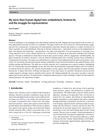 PROPHET, Jane (2025). My more-than-human digital twin: embodiment, feminist AI, and the struggle for representation. AI & SOCIETY. [Article]