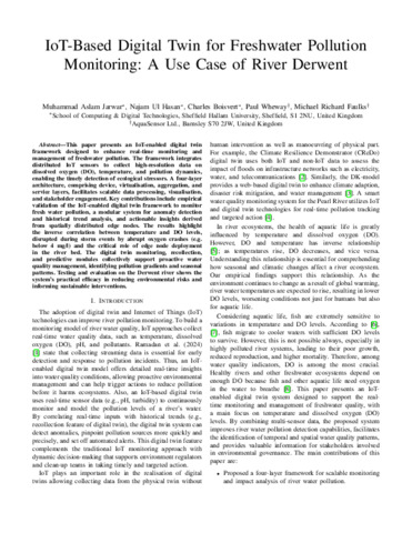 JARWAR, Aslam, UL HASAN, Najam, BOISVERT, Charles, WHEWAY, Paul and FAULKS, Michael (2025). IoT-Based Digital Twin for Freshwater Pollution Monitoring: A Use Case of River Derwent. In: 2025 IEEE 36th International Symposium on Personal, Indoor and Mobile Radio Communications (PIMRC). IEEE. [Book Section]