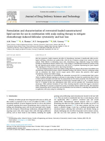 TOTEA, AM, THOMAS, A, GEORGOPOULOS, Nik and CONWAY, BR (2026). Formulation and characterisation of resveratrol-loaded nanostructured lipid carriers for use in combination with scalp cooling therapy to mitigate chemotherapy-induced follicular cytotoxicity and hair loss. Journal of Drug Delivery Science and Technology, 115 (1): 107671. [Article]