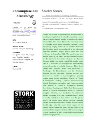 STRAFFORD, Ben, BELL, Lee and STONE, Joseph (2025). Snooker Science: A Cross-Discipline Scoping Review. Communications in Kinesiology, 1 (7). [Article]