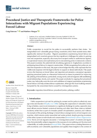 PATERSON, Craig and MORGAN, Matthew (2025). Procedural Justice and Therapeutic Frameworks for Police Interactions with Migrant Populations Experiencing Forced Labour. Social Sciences, 14 (11): 638. [Article]