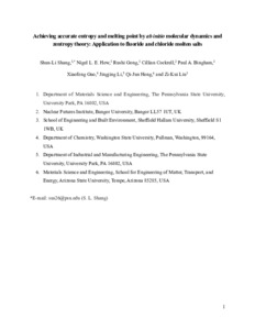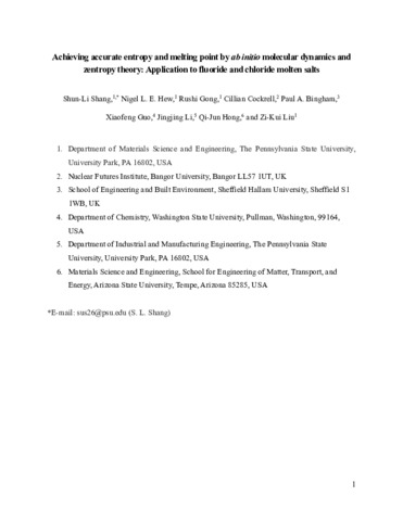 SHANG, Shun-Li, HEW, Nigel LE, GONG, Rushi, COCKRELL, Cillian, BINGHAM, Paul, GUO, Xiaofeng, LI, Jingjing, HONG, Qi-Jun and LIU, Zi-Kui (2025). Achieving accurate entropy and melting point by ab initio molecular dynamics and zentropy theory: Application to fluoride and chloride molten salts. Journal of Molecular Liquids, 438 (A): 128651. [Article]