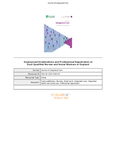 FEATHER, Julie, MCMILLAN, Isobel, GOLDSCHMIED, Anita Z, HOUGHTON, Valerie, KNIGHTING, Katherine, PEACH, Donna, PRICE, Matthew, GRADY, Emma and EVANS, Crispin (2026). Employment Destinations and Professional Registration of Dual-Qualified Nurses and Social Workers in England. Journal of Integrated Care. [Article]