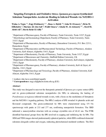 NEGM, Walaa A, ELEKHNAWY, Engy, HABIB, Doaa A, EL-MASRY, Soha M, ELBEDAIWY, Heba M, ABO-SAIF, Mariam Ali, OMARA, Walid, AL-ASHMAWY, Ghada M, ABDEL-ALL, Sherif R and EL AFIFY, Sherin Refat (2026). Targeting ferroptosis and oxidative stress: Ipomoea pes-caprae-synthesized selenium nanoparticles accelerate healing in infected wounds via Nrf2/HO-1 activation. Journal of Drug Delivery Science and Technology, 115 (1): 107694. [Article]