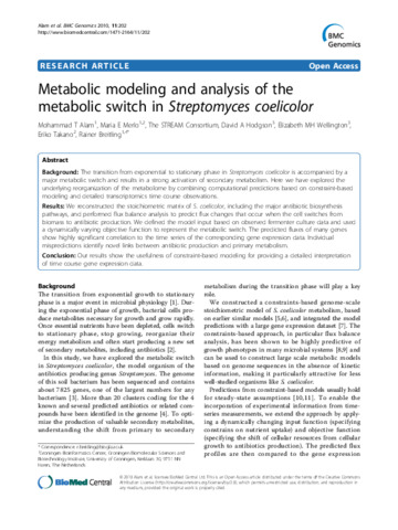 ALAM, Mohammad T, MERLO, Maria E, STREAM CONSORTIUM, HODGSON, David A, WELLINGTON, Elizabeth MH, TAKANO, Eriko and BREITLING, Rainer (2010). Metabolic modeling and analysis of the metabolic switch in Streptomyces coelicolor. BMC genomics, 11 (1): 202. [Article]