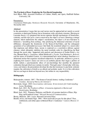 BLACK, Jack (2025). The Psychosis of Race: Exploring the Post-Racial Imagination [Abstract only]. In: Continental Philosophy Northwest Research Network, University of Manchester, UK, 7 Nov 2025. Continental Philosophy Northwest Research Network. (Unpublished) [Conference or Workshop Item]