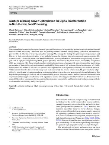 RASHVAND, Mahdi, DEHKHARGHANIAN, Nahal, NIKZADFAR, Mehrad, JAVED, Tasmiyah, LUKE, Leo Pappukutty, O’BRIEN, Alexander, SHENFIELD, Alex, GENOVESE, Francesco, MATERA, Attilio, ALTIERI, Giuseppe, DI RENZO, Giovanni Carlo and ZHANG, Hongwei (2025). Machine Learning-Driven Optimization for Digital Transformation in Non-thermal Food Processing. Food and Bioprocess Technology, 18, 10283-10316. [Article]