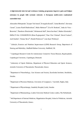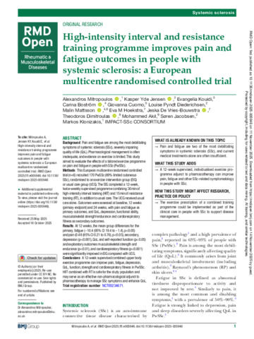 MITROPOULOS, Alexandros, JENSEN, Kasper Yde, KOUIDI, Evangelia, BOSTRÖM, Carina, CUOMO, Giovanna, DIEDERICHSEN, Louise Pyndt, MATTSSON, Malin, HOEKSTRA, Eva M, DE VRIES-BOUWSTRA, Jeska, DIMITROULAS, Theodoros, AKIL, Mohammed, JACOBSEN, Søren and KLONIZAKIS, Markos (2025). High-intensity interval and resistance training programme improves pain and fatigue outcomes in people with systemic sclerosis: a European multicentre randomised controlled trial. RMD Open, 11 (4): e005946. [Article]