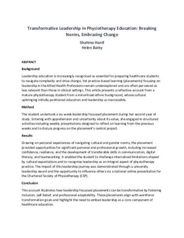 HANIF, Shahina and BATTY, Helen (2025). Transformative Leadership in Physiotherapy Education: Breaking Norms, Embracing Change. BMJ Leader. [Article]