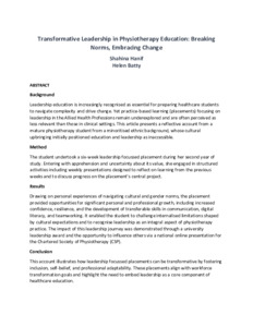 Drawing on personal experiences of navigating cultural and gender norms, the placement provided opportunities for significant personal and professional growth, including increased confidence, resilience and development of transferable skills in communication, digital literacy and teamworking. It enabled the student to challenge internalised limitations shaped by cultural expectations and recognise leadership as an integral aspect of physiotherapy practice. The impact of this leadership journey was demonstrated through a university leadership award and the opportunity to influence others via a national online presentation for the Chartered Society of Physiotherapy.Conclusion
