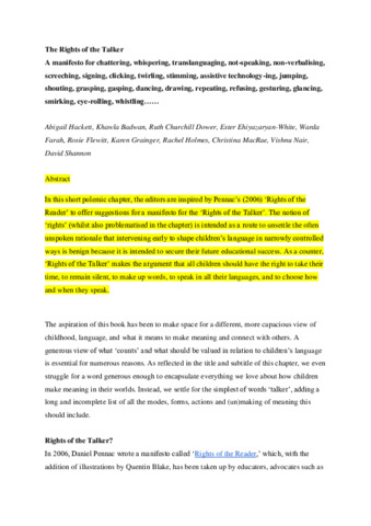 HACKETT, Abigail, BADWAN, Khawla, DOWER, Ruth Churchill, EHIYAZARYAN-WHITE, Ester, FARAH, Warda, FLEWITT, Rosie, KAREN, Grainger, HOLMES, Rachel, MACRAE, Christina, NAIR, Vishnu KK and SHANNON, David Ben (2025). The Rights of the Talker. In: BADWAN, Khawla, DOWER, Ruth Churchill, FARAH, Warda, FLEWITT, Rosie, HACKETT, Abigail, HOLMES, Rachel, MACRAE, Christina, NAIR, Vishnu and SHANNON, David Ben, (eds.) Language, Place, and the Body in Childhood Literacies. Expanding Literacies in Education Series . Routledge, 237-249. [Book Section]