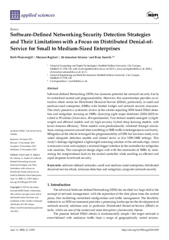 WAINWRIGHT, Ruth, BAGHERI, Maryam, SALAMA, Abdussalam and SAATCHI, Reza (2025). Software-Defined Networking Security Detection Strategies and Their Limitations with a Focus on Distributed Denial-of-Service for Small to Medium-Sized Enterprises. Applied Sciences, 15 (23): 12389, 1-21. [Article]