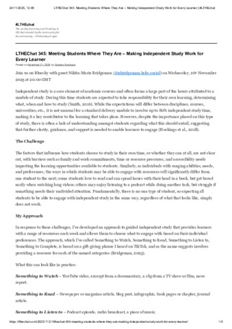 BRIDGEMAN, Nikita-Marie (2025). LTHEChat 345: Meeting Students Where They Are – Making Independent Study Work for Every Learner. #LTHEchat. [Other]
