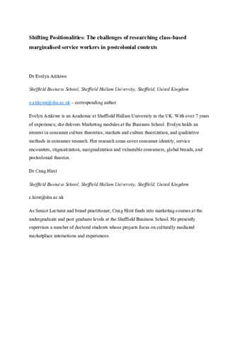 AZIKIWE, Evelyn and HIRST, Craig (2025). Shifting positionalities: the challenges of researching class-based marginalised service workers in postcolonial contexts. Journal of Marketing Management, 41 (15-16), 1673-1697. [Article]