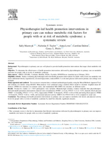 MASTWYK, Sally, TAYLOR, Nicholas F, LOWE, Anna, DALTON, Caroline and PEIRIS, Casey L (2026). Physiotherapist-led health promotion interventions in primary care can reduce metabolic risk factors for people with or at risk of metabolic syndrome: a systematic review. Physiotherapy, 130: 101837. [Article]