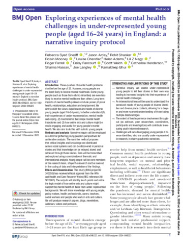 SYED SHERIFF, Rebecca, ARDAY, Jason, SHANKAR, Rohit, MOONEY, Roisin, CHANDLER, Louise, ADAMS, Helen, NAGY, Lili Z, FARRELL, Roger, FANCOURT, Daisy, WEICH, Scott, HENDERSON, Catherine, HASSAN, Shaima, LANGLEY, Joe and BHUI, Kamaldeep (2025). Exploring experiences of mental health challenges in under-represented young people (aged 16-24 years) in England: a narrative inquiry protocol. BMJ open, 15 (11): e098223. [Article]